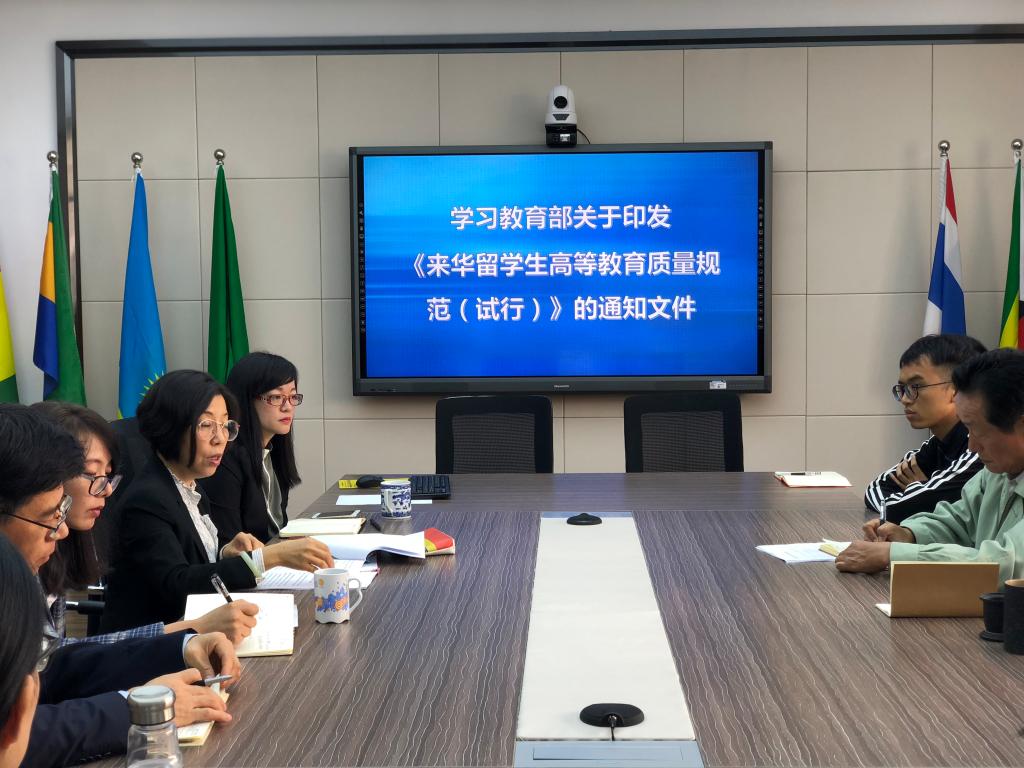 会议学习了《教育部关于印发<来华留学生高等教育质量规范(试行)》的通知文件的精神。全体教工针对人才培养目标、招生录取和预科、教育教学等方面结合实际工作展开学习讨论。太阳集团tyc539副院长陈军指出,要将中国地理、社会、主流文化意识形态及社会主义核心价值观融入通识课程教育,推动来华国际学生形成良好的法制意识和道德意识。会议指出,应当完善来华国际学生招生网站建设,畅通招生渠道和投诉举报渠道,提高我院国际学生招录规范性,保障来华留学生合法权益,维护教育秩序。