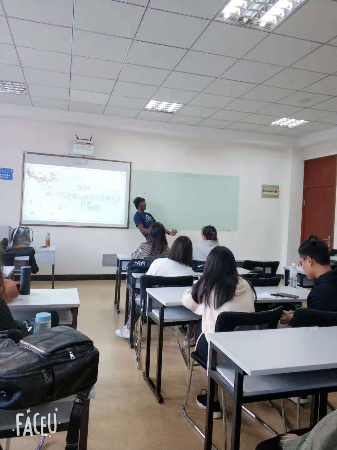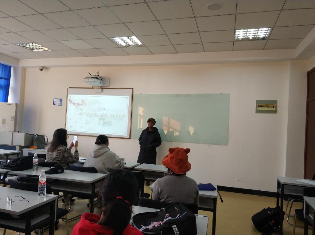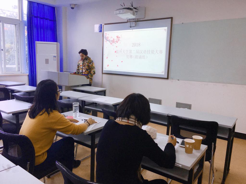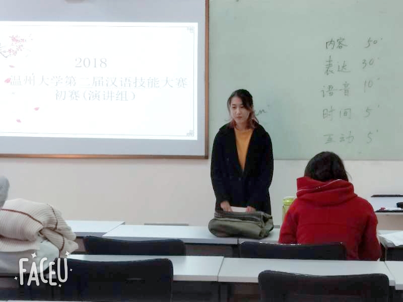 2018年11月26日下午3点半,我校第二届留学生汉语技能大赛初赛在太阳集团tyc539举办,来自韩国、泰国、喀麦隆、意大利、乌干达、埃塞俄比亚等多个国家的留学生参加了本次比赛。本次比赛涵盖演讲、歌唱、朗诵三个类别,分别在不同的教室同时进行。为了确保本次大赛评比的公开、公平、公正性,本次比赛邀请了六位老师作为此次比赛的评委。其中郑婷和金碧两位老师为演讲组的评委,阚文文和徐丽丽两位老师为朗诵组的评委,包含丽和张珉璐两位老师为歌唱组的评委。在比赛开始之前,各位老师首先向学生细致讲解了本次比赛的基本要求和打分细则,并通过抽签的形式确定参赛选手的顺序。