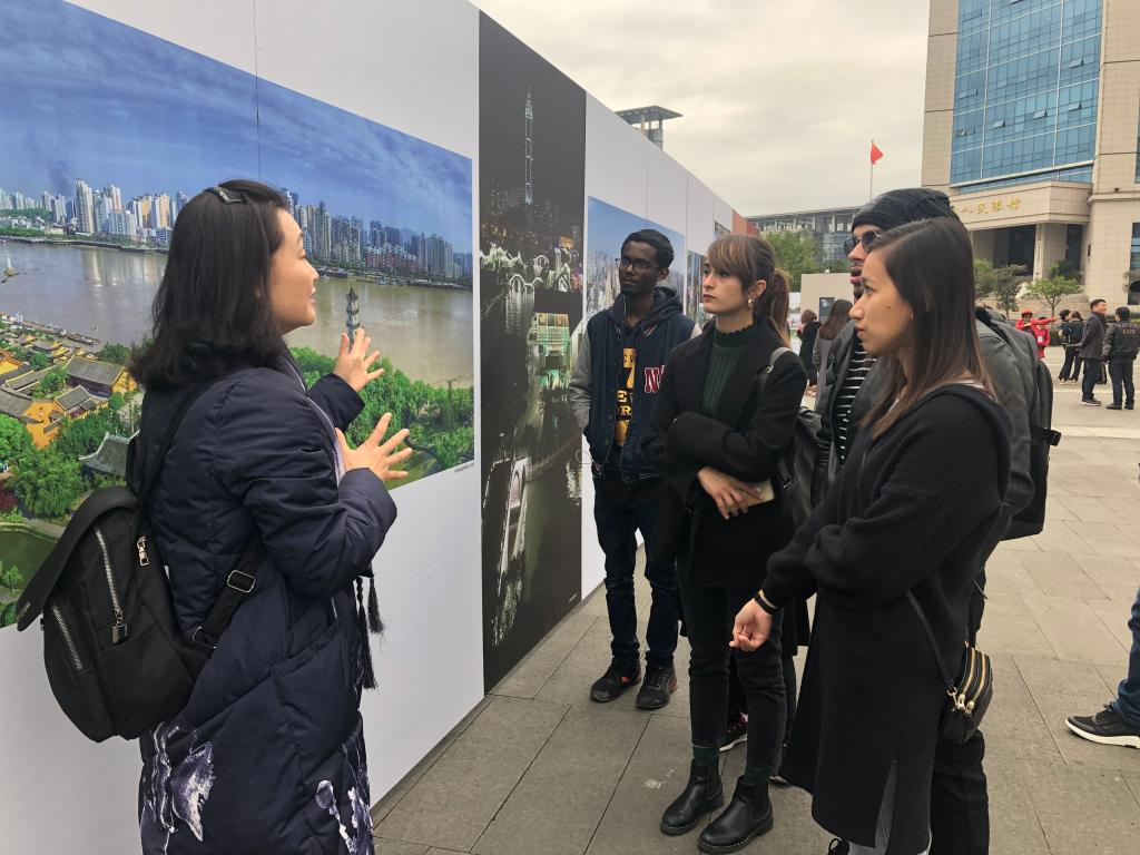 26日下午,太阳集团tyc539来自“一带一路”国家的国际学生来到温州大剧院广场,跟随温州市委宣传部胡剑谨部长的脚步,一边听取讲解员的介绍,还不时停下来询问,胡部长亲切地给予他们解答说明。通过图片,国际学生们能够更直观地了解改革开放40年来温州城乡面貌发生的巨大变化、百姓生活发生的历史性变革和取得的历史性成就,特别是看到他们自己所熟悉的地方和建筑的前世今生后,不时发出阵阵惊叹。参观结束后,国际学生讲述了他们参观后的感受。
