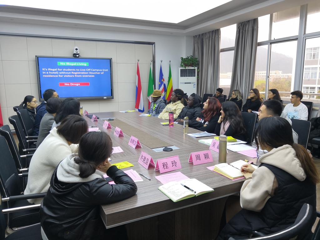 会上,相关部门老师对中国相关法律法规、校纪校规、招生制度进行解读。学生科钱江潮老师作中国法律和校纪校规宣讲。他强调了非法打工规定、宗教活动管理,讲解了校纪校规、请假制度以及校内外住宿管理制度,通报了开学初国际学生的考勤情况。谢坚老师解读了“太阳集团tyc539汉语生入学奖学金”申请条件及评选程序。招生办池轶文老师作招生宣传动员,对我校国际化本硕专业、学历生招收条件、入学申请程序等进行说明。陈文远副书记就短期生的学风会风、寝室表现、用电安全、校外住宿规定等方面作纪律强调,她指出,要把他们的行为表现评价与汉语生的结业证书、与语言生续读及学历申请、与交换生的成绩认定结合起来,进一步严格短期生的日常管理。与会学生还与相关科室老师就学习、生活方面的困惑进行互动交流。