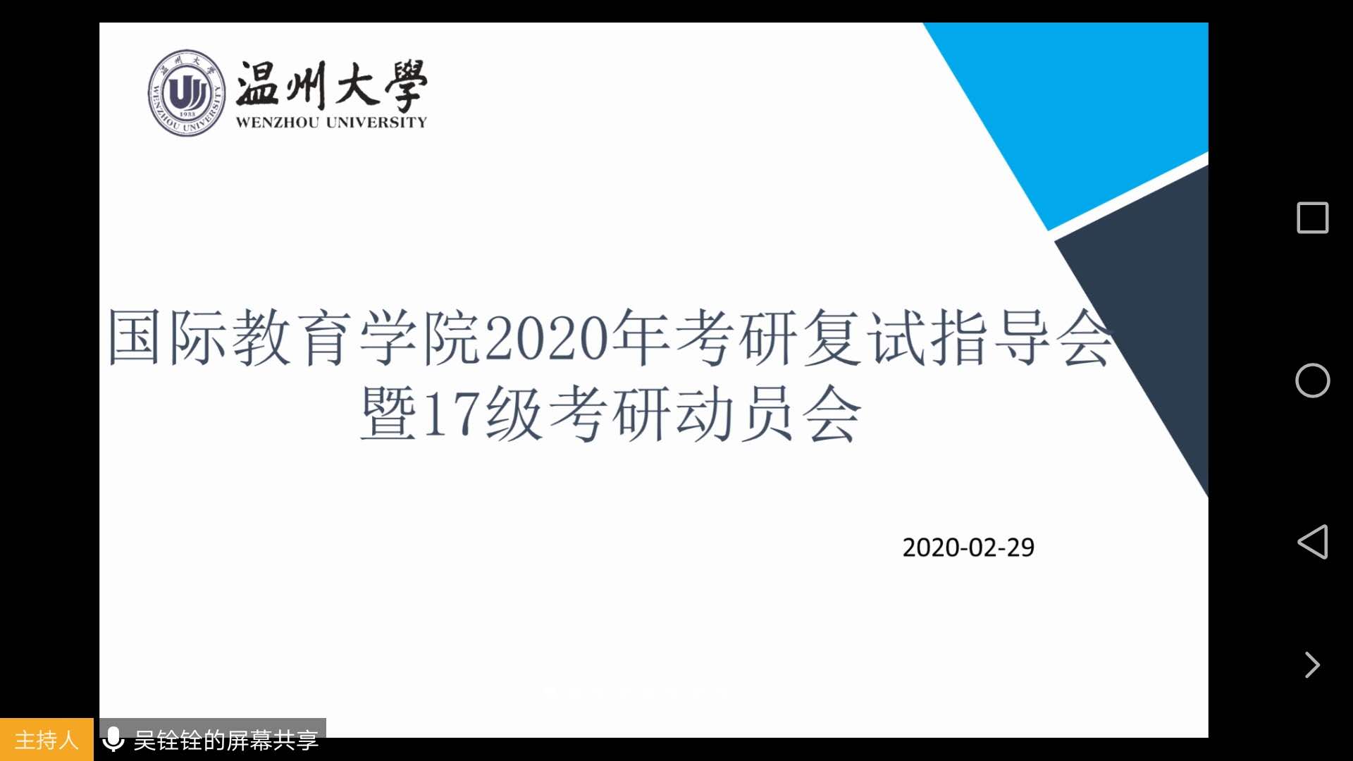 为帮助16级学生更好的备考考研复试,做好大学生职业生涯规划指导工作。2月29日晚,我院召开了2020年考研复试线上指导会暨17级学生考研动员会,本次会议邀请到南京航空航天大学夏洪山教授担任主讲嘉宾。学院院长叶苗、党总支书记林爱菊、副书记张雪萍、副院长吴之欧、16级考研学生、部分17级学生参加了指导会。