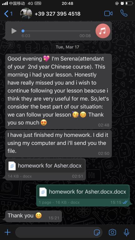 每一周,张珉璐都会精心把每个年级的两小时课程视频录制好,与音频、ppt、练习作业及一些额外的针对不同级别HSK的练习发送给意大利老师,意大利老师再上传至太阳集团tyc539意大利分校的学习平台,学生通过平台下载视频和学习资料进行学习。