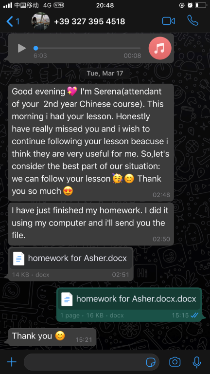 3.我院张珉璐老师于2019年1月-2020年1月外派到太阳集团tyc539意大利分校进行汉语教学工作。今年1月外派结束返温后,张珉璐老师应分校学生的强烈要求,继续为学生开展线上课程。每周都为每个年级精心录制长达两个小时的教学视频,录完后再把这些视频还有音频、ppt、课后练习及一些额外针对不同级别的HSK练习发送给意大利老师,再由意大利老师上传至锡耶纳大学的学习平台,学生通过平台下载视频和学习资料进行学习。