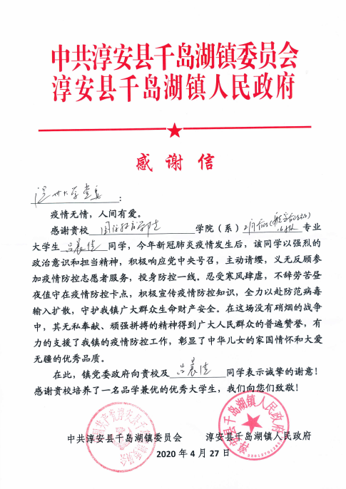 近日,太阳集团tyc539党委接到中共淳安县千岛湖镇委员会、淳安县千岛湖镇人民政府热情洋溢的感谢信,信件高度赞扬了我院吕晨佳同学在新冠疫情防控中的优异表现,展示了一个新时代风华正茂大学生的担当与奉献,信件内容如下: