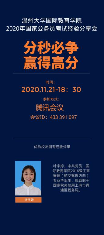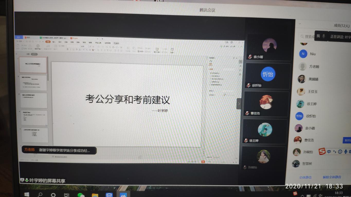 2020年11月21日晚,我院于线上召开了公务员考试经验分享交流会。会议邀请到我院优秀校友,现就职于国家税务总局上海市青浦区税务局的叶宇婷作为分享嘉宾,学院党总支副书记方建晓参加了会议。本次分享会由学工办辅导员吴铨铨主持。