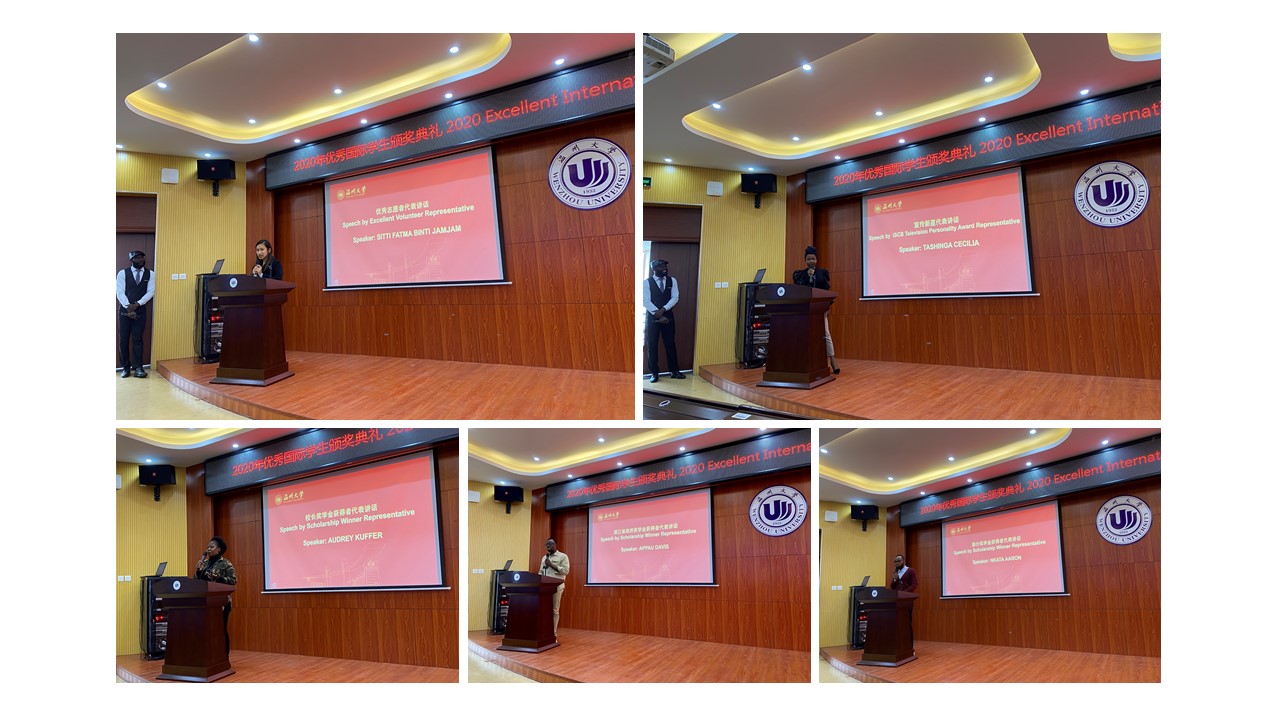 此次颁奖典礼设立了两个特殊的奖项:优秀国际学生志愿者和宣传新星奖。受新冠疫情影响,我校国际学生公寓采取封闭式管理,期间涌现了一批国际学生志愿者,他们在寒暑假期间坚持每天走访负责的宿舍,为每位国际学生登记健康码、检测体温并做好记录与汇报工作,他们的奉献精神影响了国际学生社区的其他同学,也为我校抗疫工作做出了不可忽视的贡献。宣传新星奖为我院新成立的国际学生电视台设立,他们活跃在校园各处,发掘校园新闻,不仅仅为在校学生传递信息,更为在国外的学生带去学校的温暖,拉近了我校与境外学生的距离。优秀国际学生志愿者代表SITTI FATMA BINTI JAMJAM和宣传新星奖代表TASHINGA CECILIA分别发言,他们分享自己的工作经验和感想,引起台下师生共鸣,众多国际学生受到鼓舞。