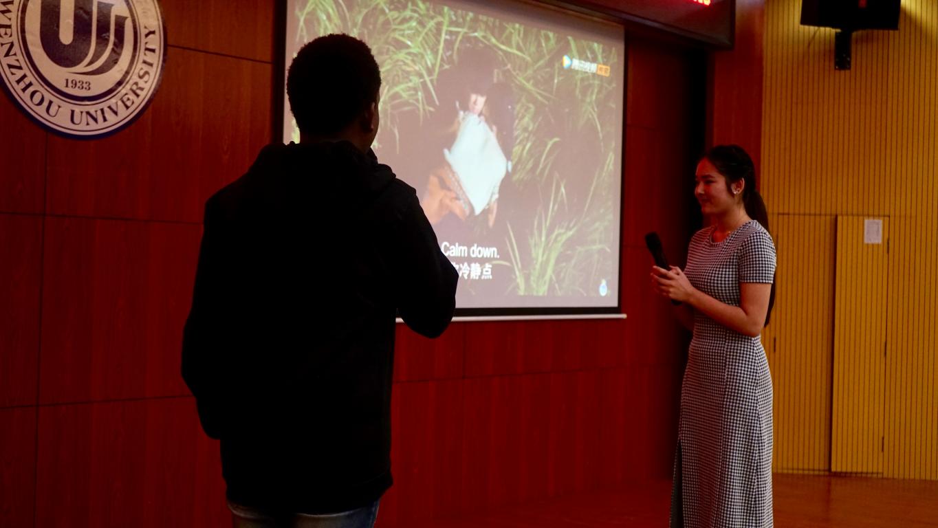 比赛开场,便是妙趣横生的配音比赛。陈氏玉映以流利的口语,一人分饰二角,生动展示了《将军在上》中一对新婆媳之间的有趣对话,赢得了老师同学们的满堂喝彩。陈梦瑶、陆求是别出心裁,选取了《酋长的男人》中的片段进行配音,表达准确,情感真挚,让观众一时间竟忘了是在看配音比赛。应可达则对《哪吒》片段进行了现场配音,用准确的表达和情感处理,将故事传递给大家。