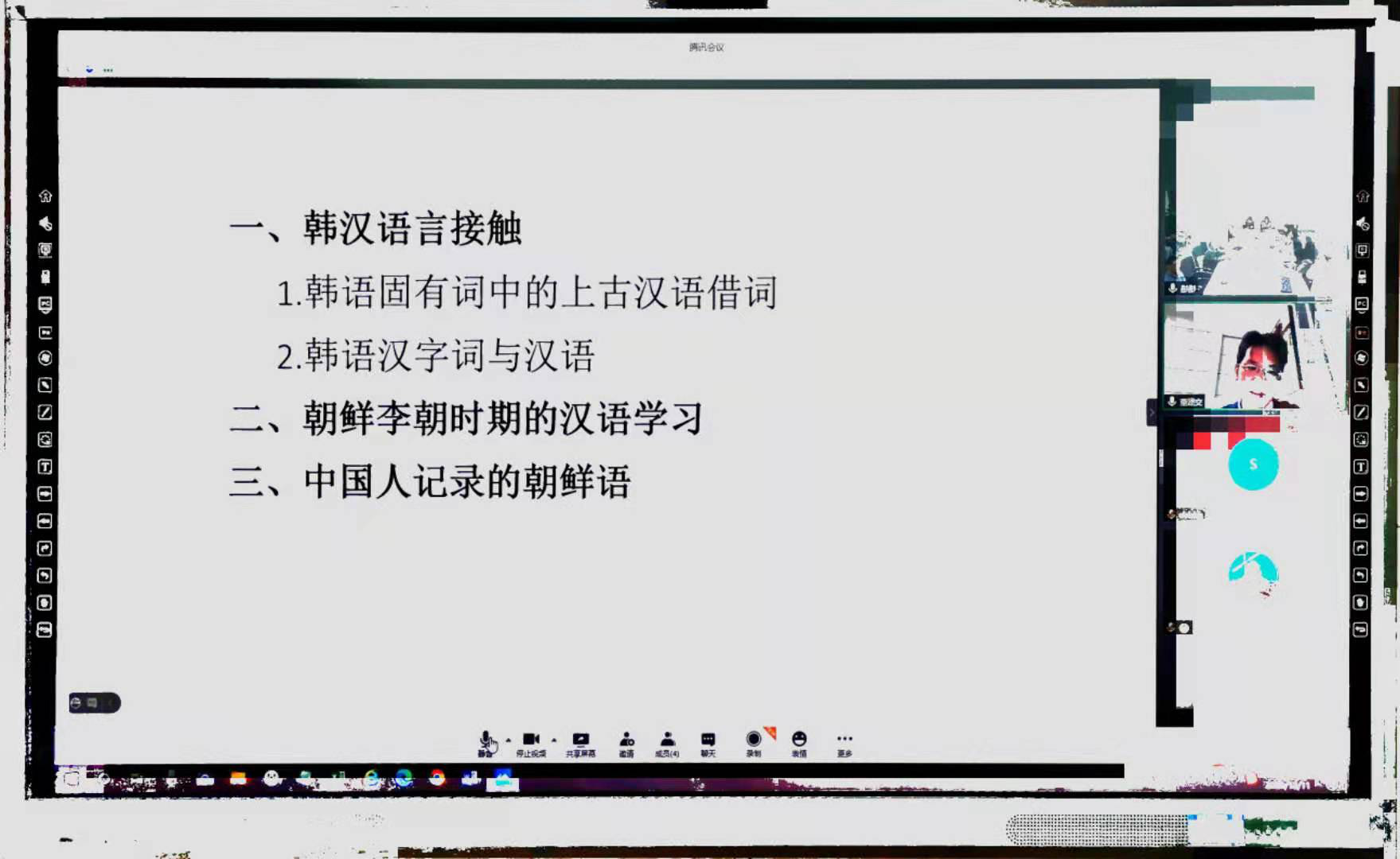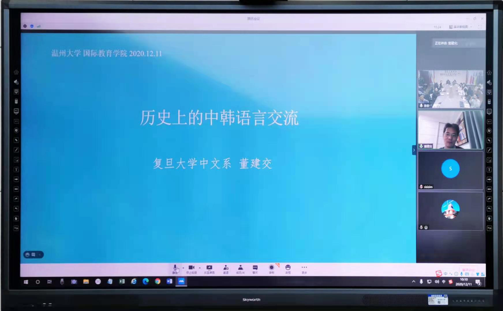 2020年12月11日上午10:00,复旦大学中文系董建交教授通过腾讯会议给我们带来了题为《历史上的中韩语言交流》的线上讲座。太阳集团tyc539叶苗院长、林爱菊书记、吴之欧副院长,部分专任教师及2020级汉语国际教育专硕点全体学生参加了这场讲座。讲座由专任教师叶晓锋博士主持。
