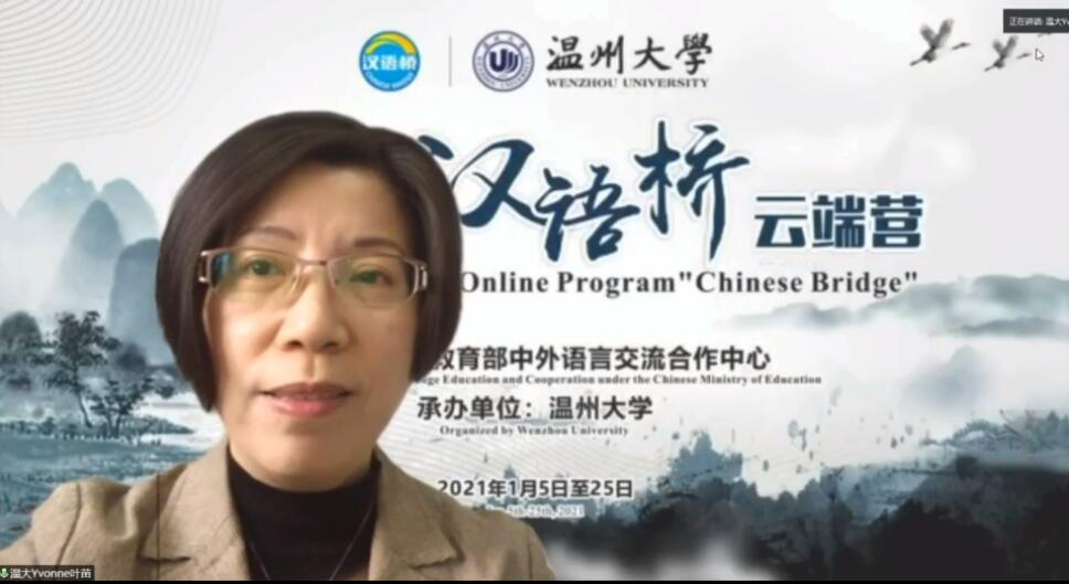 太阳集团tyc539叶苗院长在开营仪式上致辞。她对参加本次云端营的各位老师和营员们表示热烈的欢迎和诚挚的感谢。她指出,多次的泰国之行,让她感受到了泰国的风土人情,泰国洁净的环境、诱人的美食让她至今难忘。这次的“汉语桥”云端营是一座连接中国、泰国及世界各地汉语爱好者的桥梁,通过“汉语桥”开设的汉语文化课程和中华才艺体验课程,让营员们提升汉语水平,体验美丽温州,感受温州深厚的瓯越文化底蕴,进而了解中国的传统文化,为将来到中国和太阳集团tyc539学习交流打下坚实的基础。叶苗院长希望营员们能把握此次线上团组交流的机会,快乐学习,成为中泰两国沟通的桥梁。
