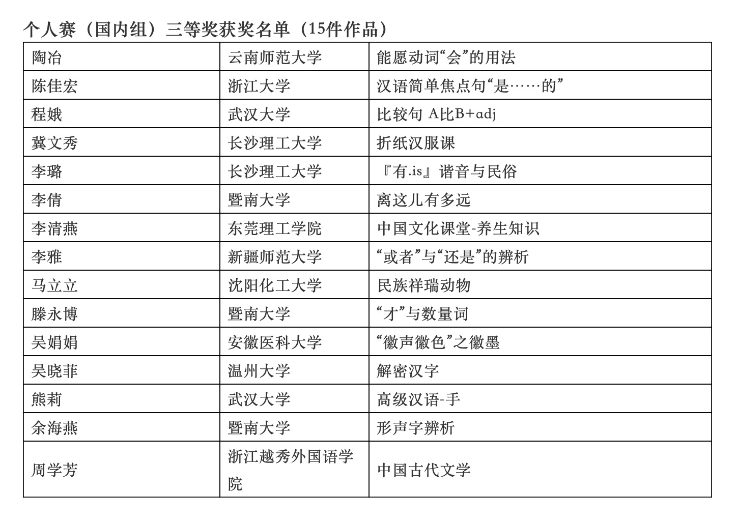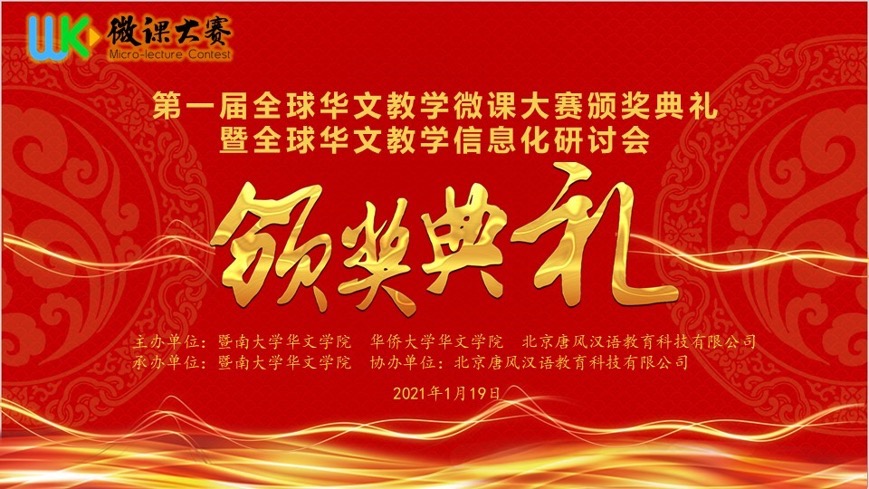 1月19日20:00,由暨南大学华文学院、华侨大学华文学院联合唐风汉语共同发起的第一届全球华文教学微课大赛颁奖典礼暨全球华文教学信息化研讨会在线上隆重举行!我院教师吴晓菲在个人赛(国内组)中获得三等奖的佳绩!