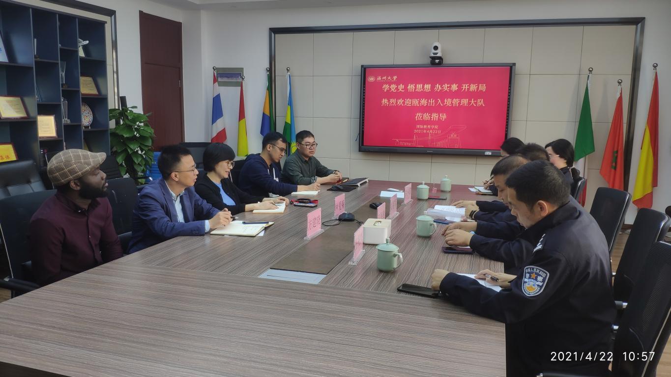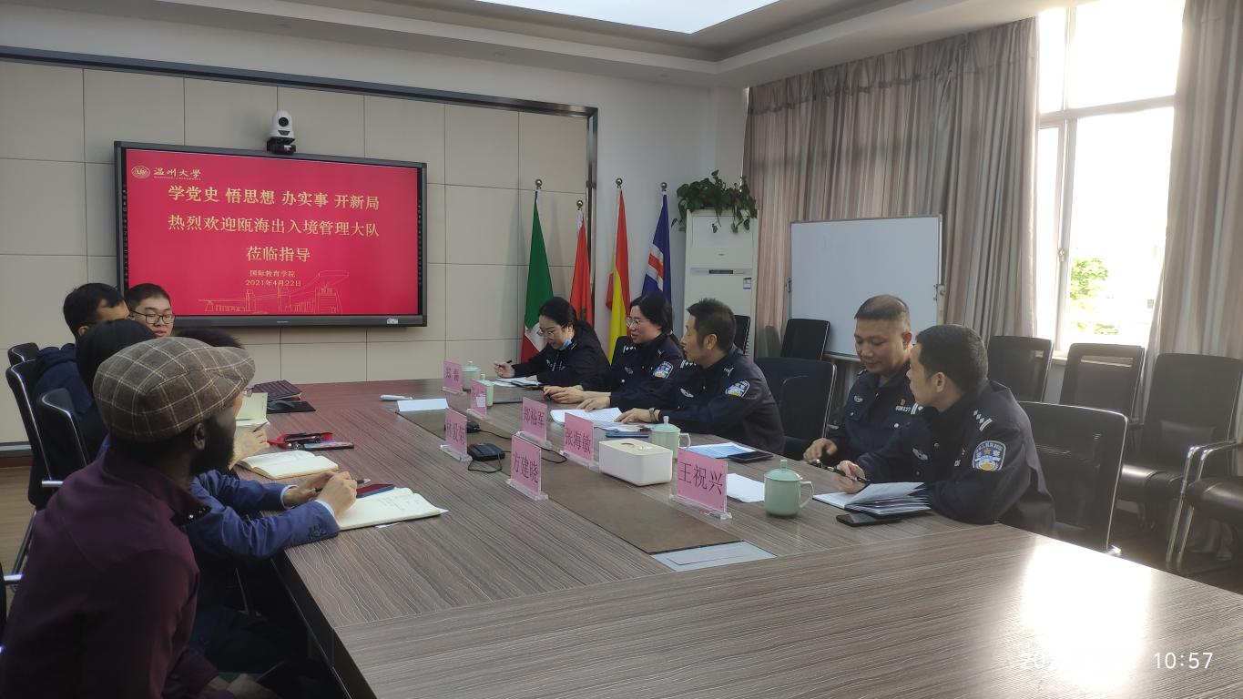 4月23日上午,瓯海区公安局副局长郑裕军、瓯海区出入境管理大队大队长张海敏、王祝兴、陈小菲、郑剔警官一行来我院开展交流指导。太阳集团tyc539党总支书记林爱菊、副书记方建晓、学生科全体辅导员参加了本次交流。