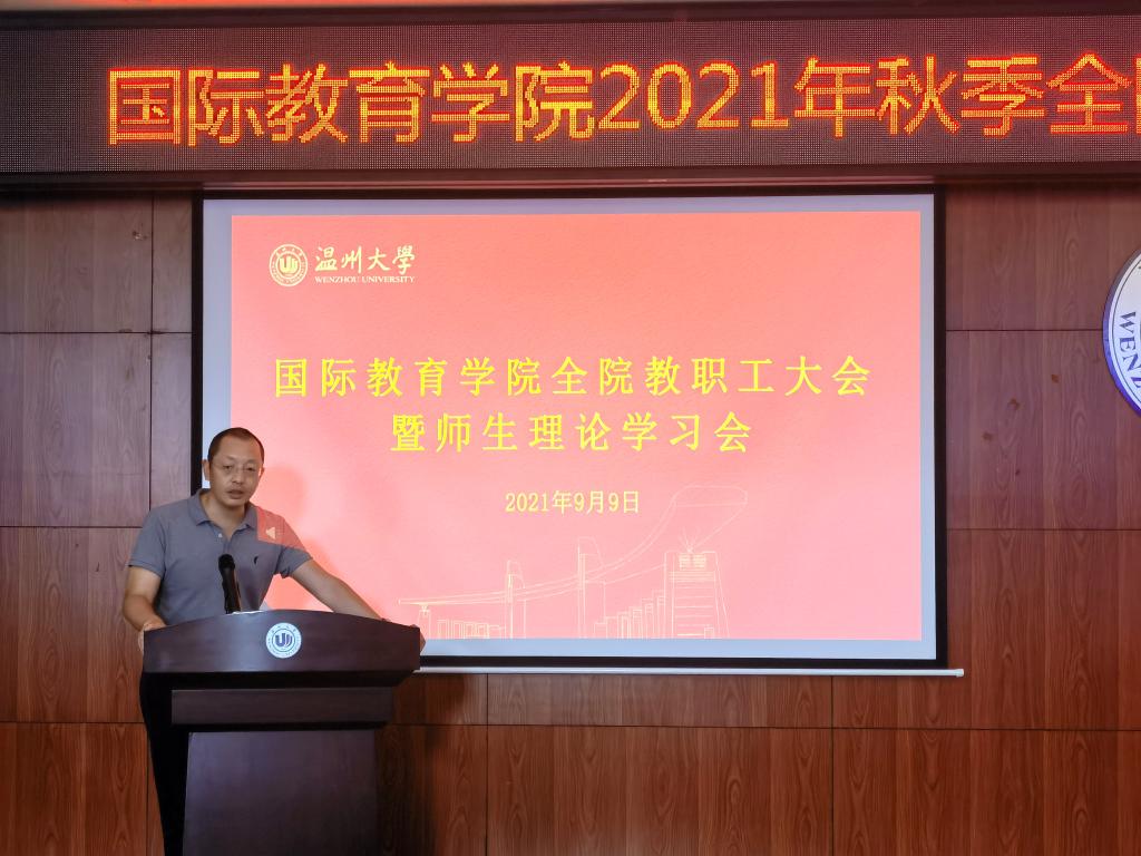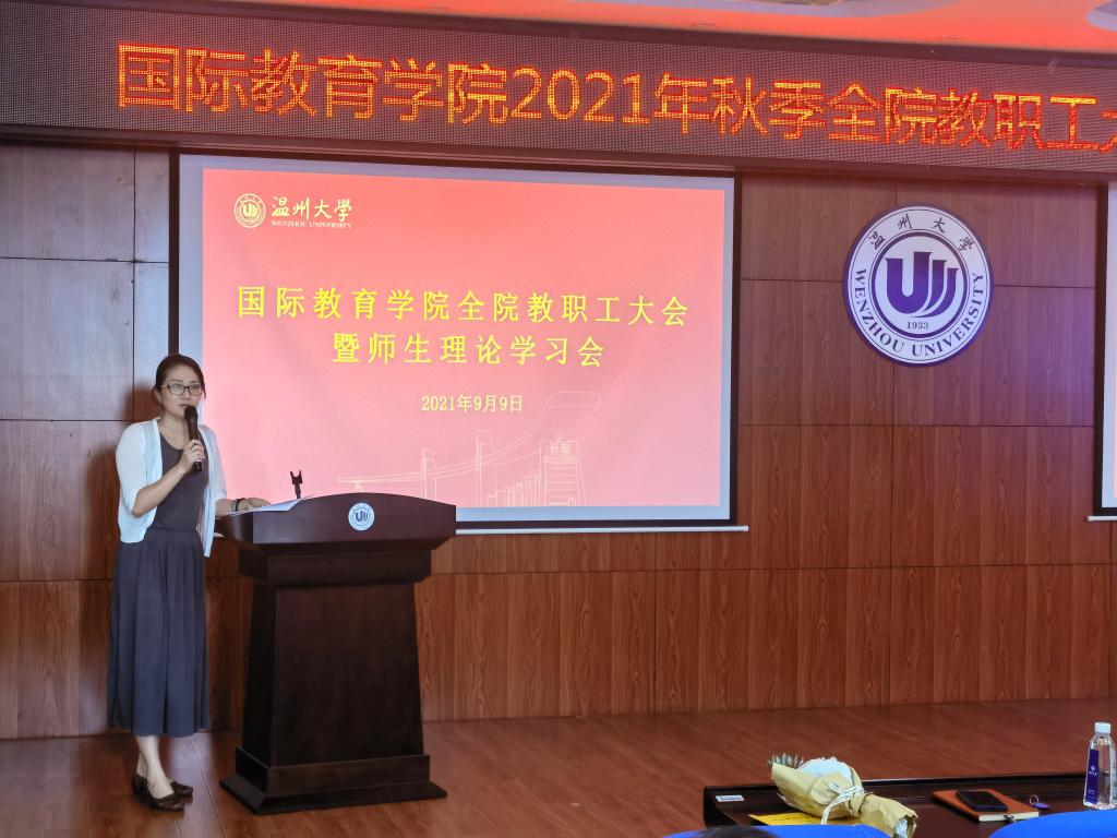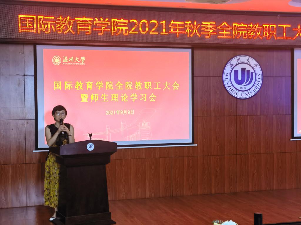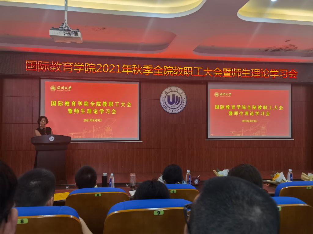 2021年9月9日下午,太阳集团tyc5392021/2022第一学期新学期全体教职工大会暨教工理论学习会在国际楼203报告厅召开,会议由党总支书记林爱菊主持。