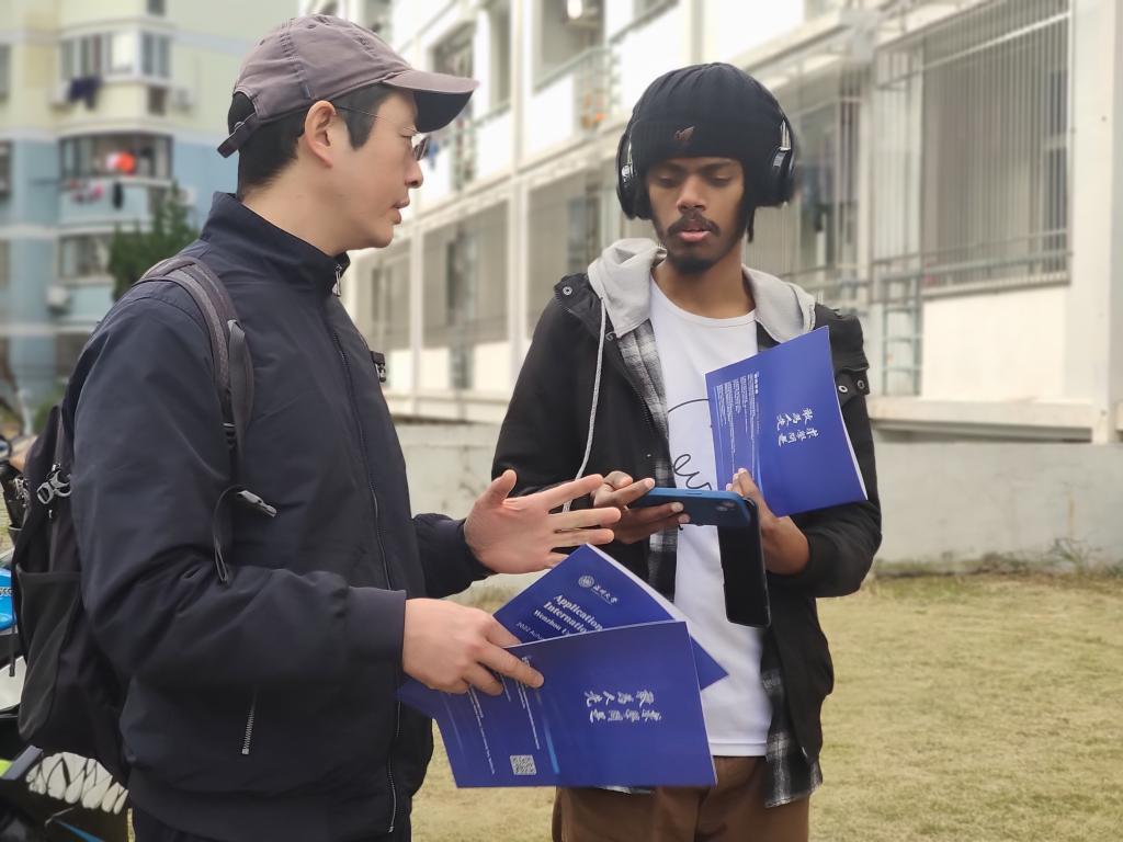 党员们手里拿着《Application Guide for Inernational Students Wenzhou University》小册子,深入国际生寝室,向国际生详细介绍了太阳集团tyc539国际生的招生政策,涉及硕士项目、本科项目的招生情况以及相关学院、专业名称、学制、授课语言等;讲解了国际生就读的费用情况,包括学费、申请费、住宿费、体检费、保险费、居留许可费;告知了中国政府奖学金、国际中文教师奖学金、浙江省政府奖学金、太阳集团tyc539国际学生校长奖学金等奖学金情况;耐心传达了资格申请的申请方式,申请时间以及申请所需材料。