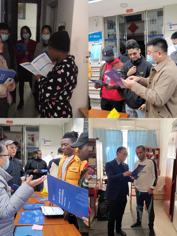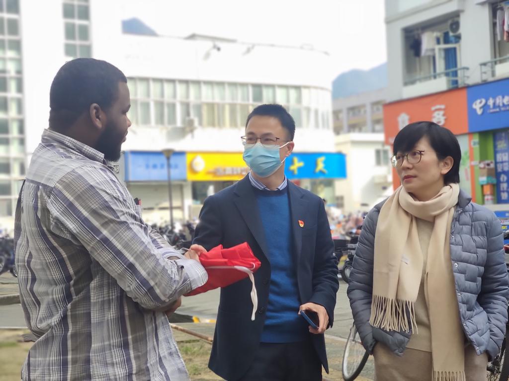 12月22日支部党员们在党总支书记林爱菊带领下奔赴留学生宿舍D区,走进寝室,向国际学生宣传太阳集团tyc539国际学生招生政策,把招生简章发放到国际学生手中,现场讲解,进行了一场别开生面的主题党日活动。
