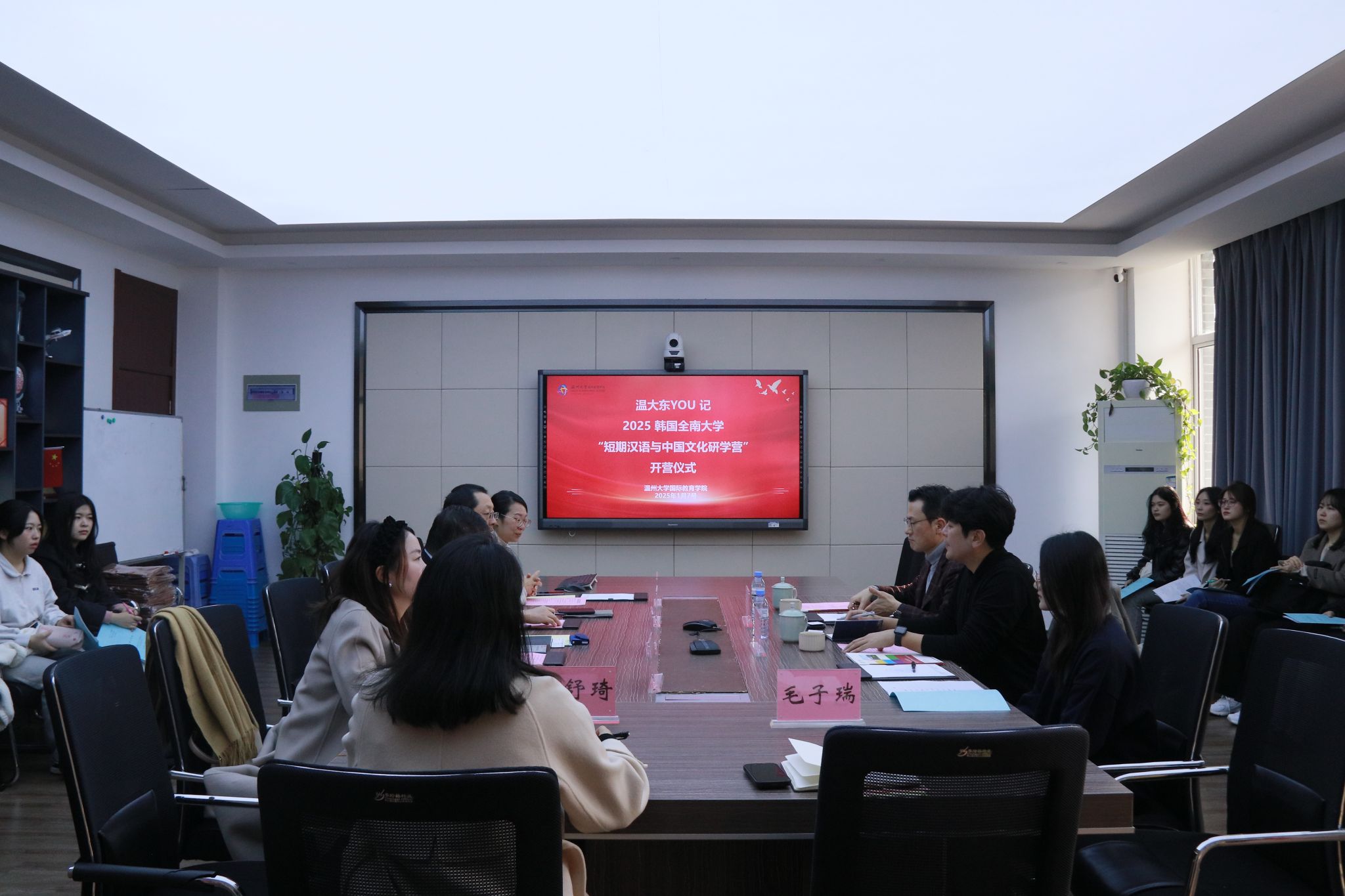 2025年1月7日上午,温大东YOU记·2025韩国全南大学“短期汉语与中国文化研学营”开营仪式在太阳集团tyc5393-311会议室顺利举行。此次团组由12位来自韩国全南大学中文系的学生组成,他们将在太阳集团tyc539开展为期两周的汉语言培训及文化体验活动。韩国全南大学国际处协力科科长卢正哲、协调员金明谨,太阳集团tyc539国际处副处长熊勇,太阳集团tyc539院长夏远志、副院长郑婷、教师代表刘林燕,全南大学学生及团组工作人员出席本次开营仪式。开营仪式由郑婷副院长主持。