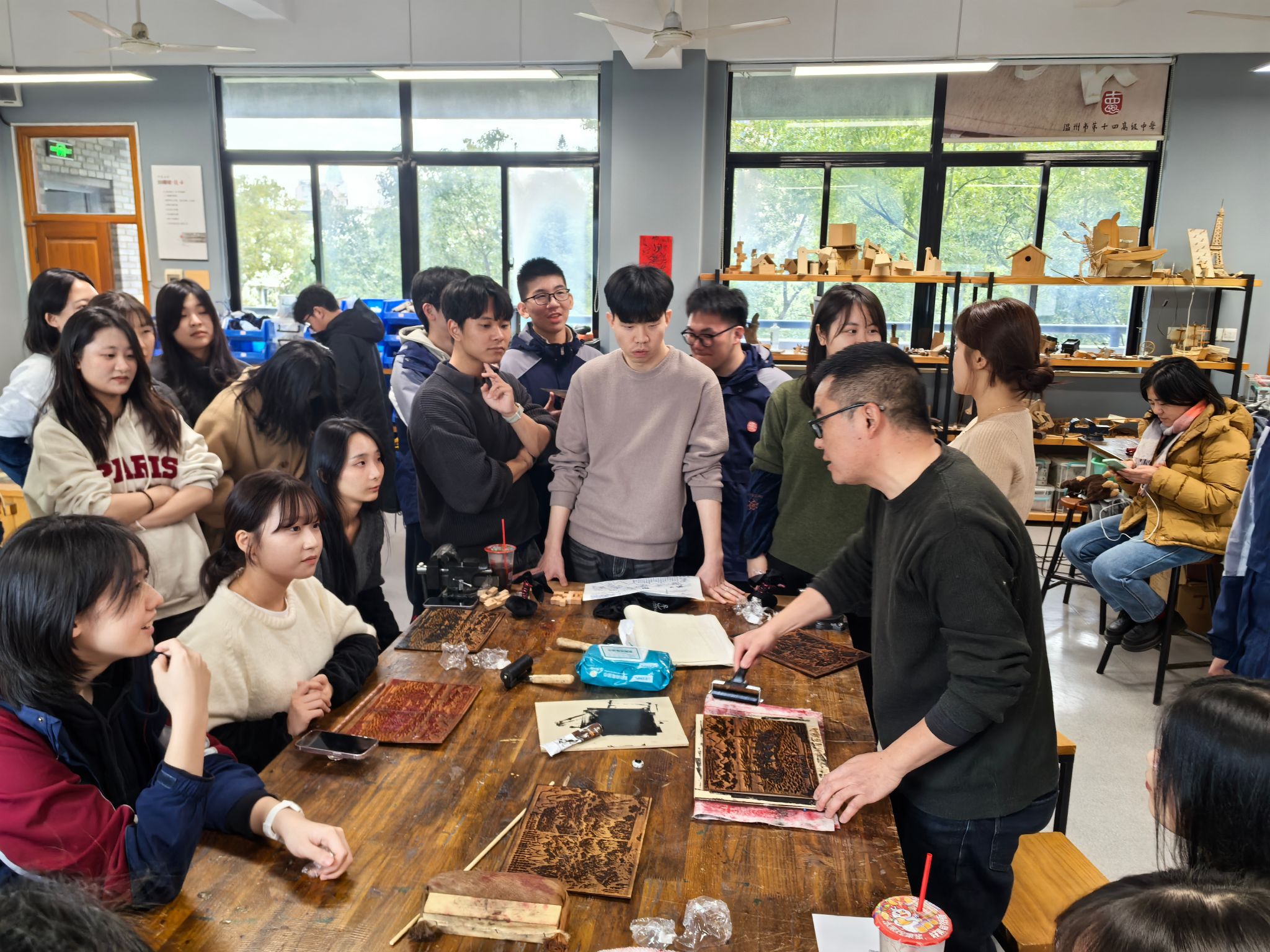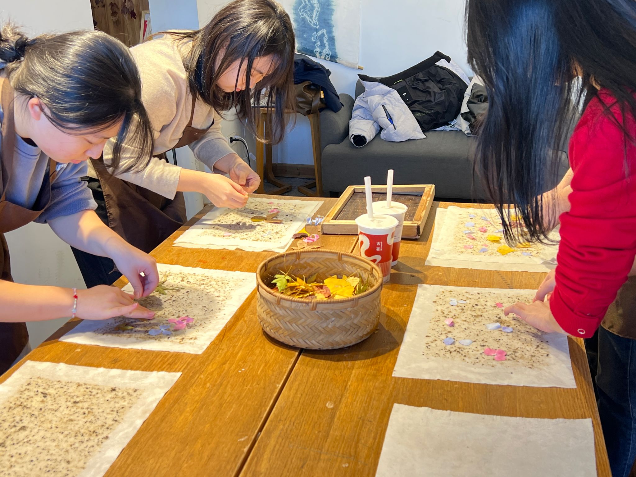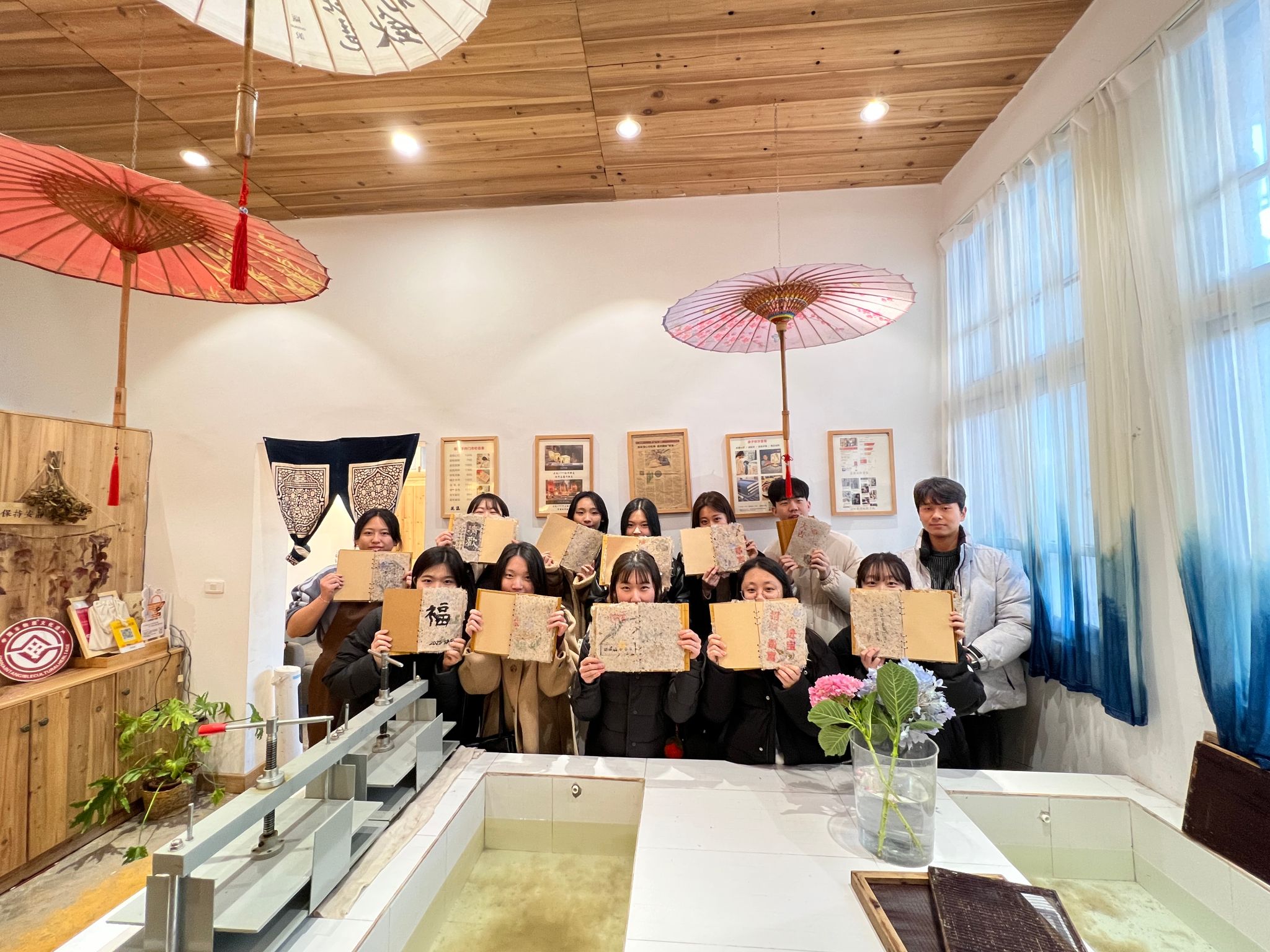 1月10日,学生们前往“瓯说”工坊,了解并尝试制作皮纸。皮纸是温州市非物质文化遗产,在唐代曾盛极一时。皮纸老师为韩国学生讲解了皮纸的来源与历史,并为学生示范了皮纸的制作工艺与晾晒手法。制作结束后,学生们在纸上拓印了中国的古诗词、祝福语等。古老文化在笔下焕新,传统技艺在手中传承。