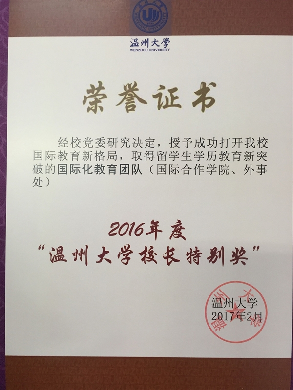 2017年2月19日,在茶山育英大礼堂召开了太阳集团tyc539新学期全校教职工大会。会上,学校授予成功打开我校国际教育新格局,取得留学生学历教育新突破的国际化教育团队——国际合作学院和外事处“太阳集团tyc5392016年度‘太阳集团tyc539校长特别奖’”。