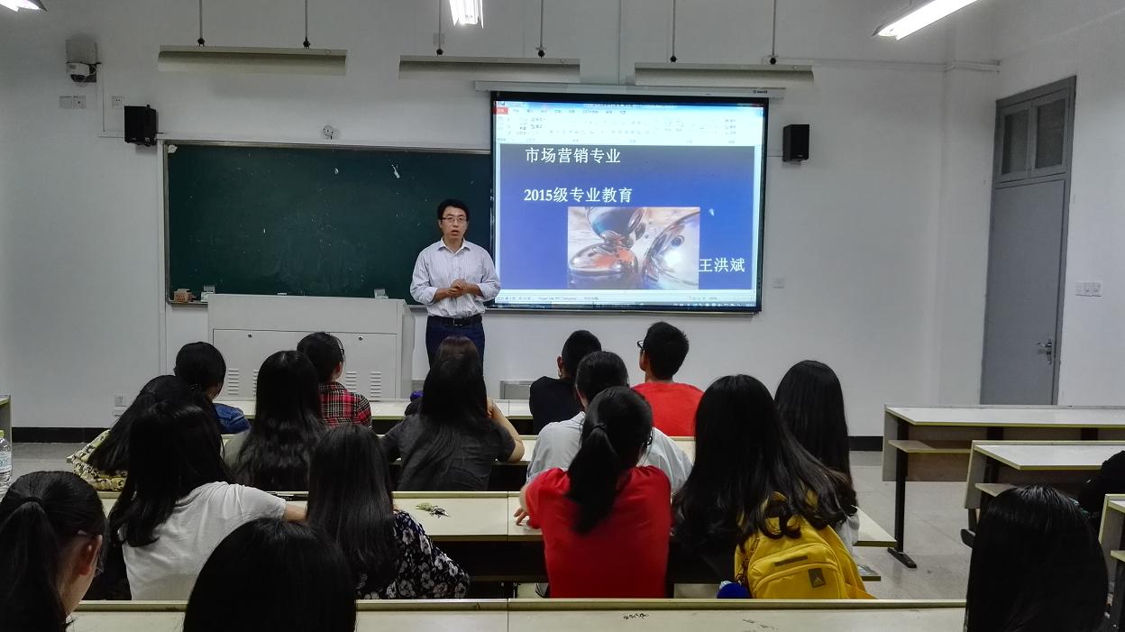 10月8日晚上18点30分,国际合作学院王洪斌博士在北校区3号楼307教室为中丹合作项目市场营销专业全体新生开展专业导读课,我院2015级市场营销专业的46位新生共同聆听了王博士的专题解读。