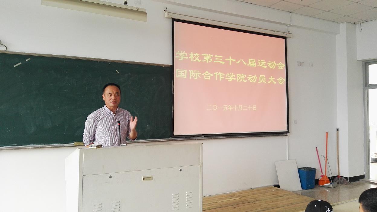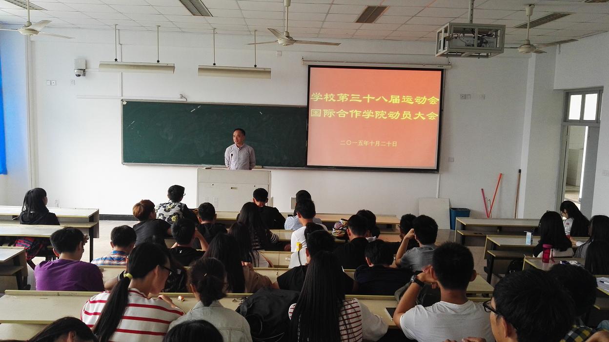 为迎接我校第三十八届运动会的到来,10月20日中午12点40分,国际合作学院校运会赛前动员大会在北校区3号楼401教室举行,参赛运动员、学生会后勤工作人员等60多人参加了会议,学院党总支书记朱建平出席了动员大会,会议由学生科谢坚老师主持。